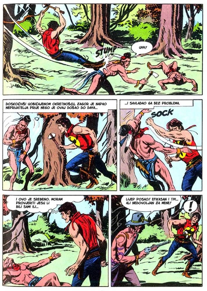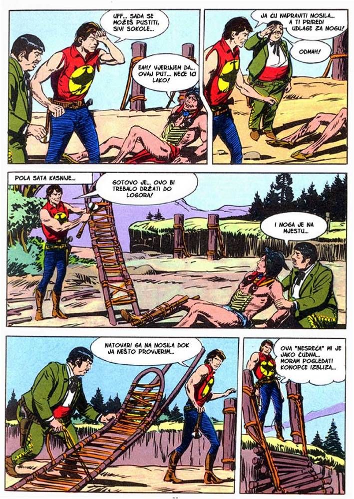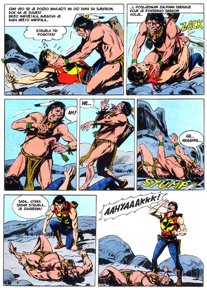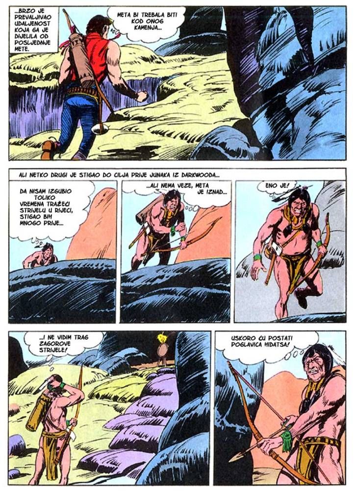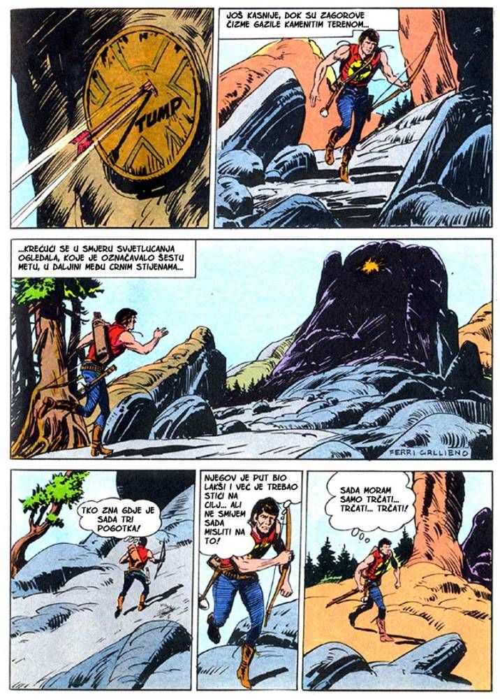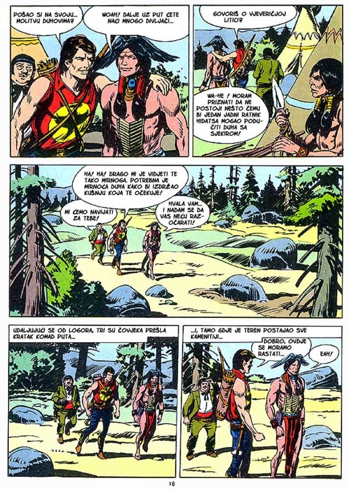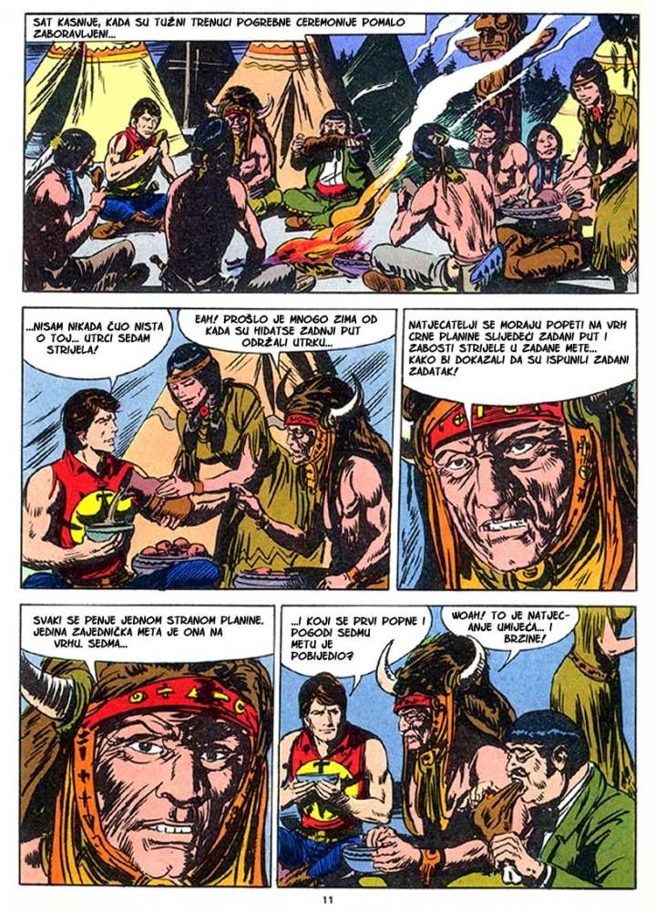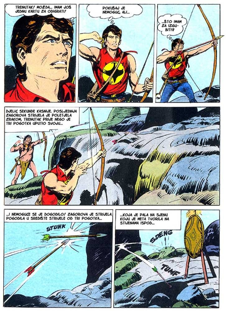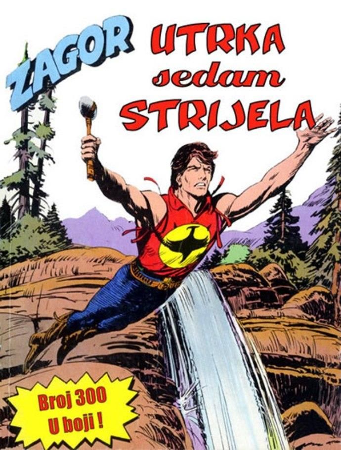 Kada umre dobar poglavica, kao što je to bio ,Medved koji hoda', na njegovo mesto potrebno je da dođe sposoban ratnik koji bi nastavio da vodi pleme na način kako je to činio njegov predhodnik. Ali ako ima više kandidata onda izbor za najboljeg zavisi od običaja plemena. Za pleme Hidatsa taj izbor se svodi na odmeravanje snage i spretnosti (veštine) kroz dvoboj koji oni nazivaju ,Trka sedam strela'! Tristoti broj koji je izašao u serijalu o Zagoru ne razlikuje se dosta od mnogih ranijih epizoda, osim po tome što je bio u boji. Ipak za priču koja je stala na stotinak strana može se reći da je solidno urađena. Nema nekog dužeg uvoda kakav je uobičajen za redovne epizode, pa se već na samom početku kreće sa akcijom koja će biti prikazana u ovih stotinak strana. Po tome se može reći da je Tonineli napravio solidnu priču za jubilarni broj. Kvalitet ove priče sigurno je da zavisi i od autora crteža, a kako je to bio F. Galieno koji je jedan od najboljih autora, onda je ova priča sa kvalitetnim crtežom imala realni priliku da se prikaže u dobrom izdanju.